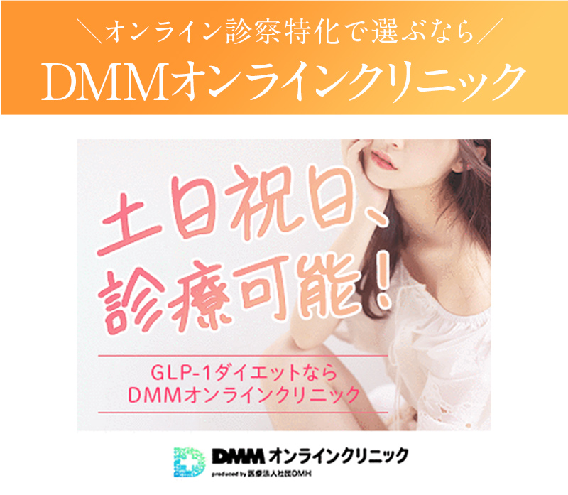 ※DMMオンラインクリニックはオンライン診療のプラットフォームサービス。診療は提携先医療機関である、医療法人社団DMCが行っています ※公的医療保険が適用されない自由診療です ※PR ※GLP-1受容体作動薬は、2型糖尿病の治療薬として厚生労働省に承認済。肥満治療目的での処方については国内では未承認ですが、現在、治験が行われています。主な副作用は、吐き気、胸やけ、下痢などの胃腸障害ですが内服継続をすることで症状は緩和していきます。一般的には問題なく服用いただける方がほとんどです。(もし症状が辛い場合は使用を中止し、担当医に相談を)