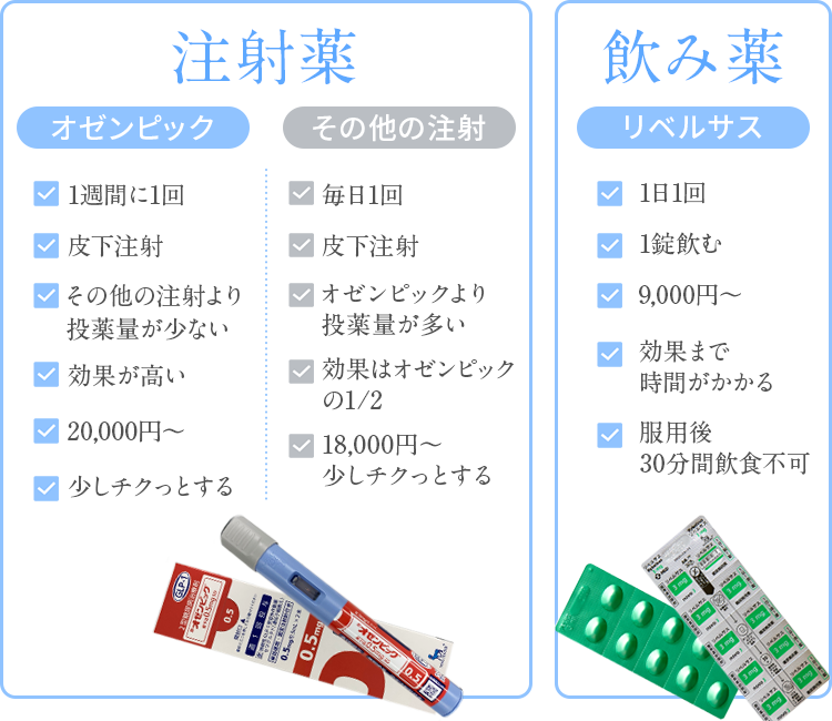 | 料金/月 | 飲み薬(リベルサス)…8,650円~ 注射薬…19,800円~ |