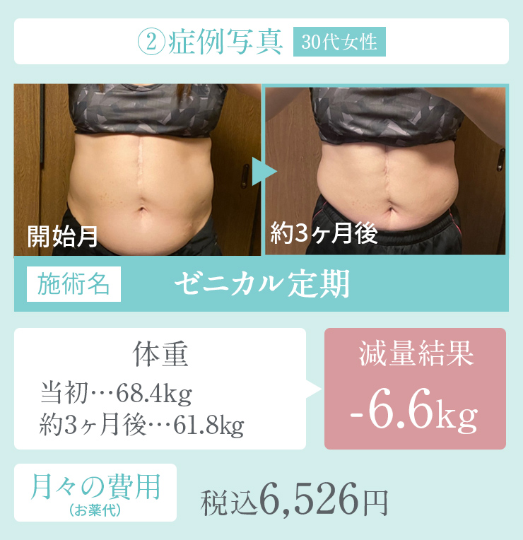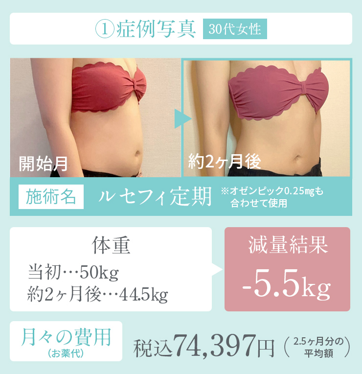 ※リベルサスやオゼンピック等を用いたダイエット診療での結果 ※副作用:悪心・嘔吐・低血糖・頻尿・多尿・膀胱炎の症状などがみられる場合があります ※費用と期間:効果を実感頂くのには平均して4~10ヶ月程度の時間がかかります。費用は平均月10,000円~20,000円程度の方が多いです ※効果・効能・副作用の現れ方は個人差がございます。医師の診察をうけ診断された適切な治療方法をお守りください